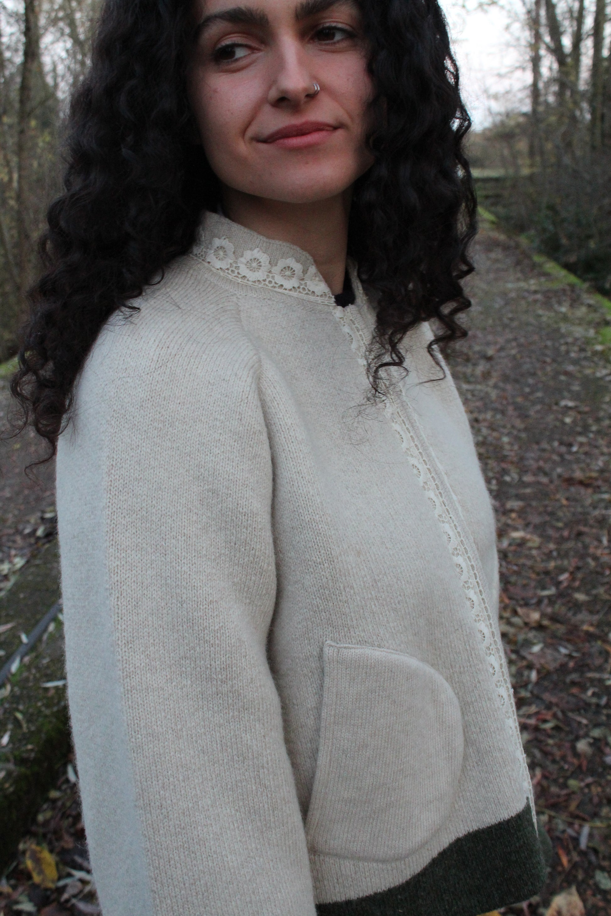 The 'Ode to Cotton' plant graphic is lovingly hand embroidered wool, meaning that every jacket is unique, your very own to love!